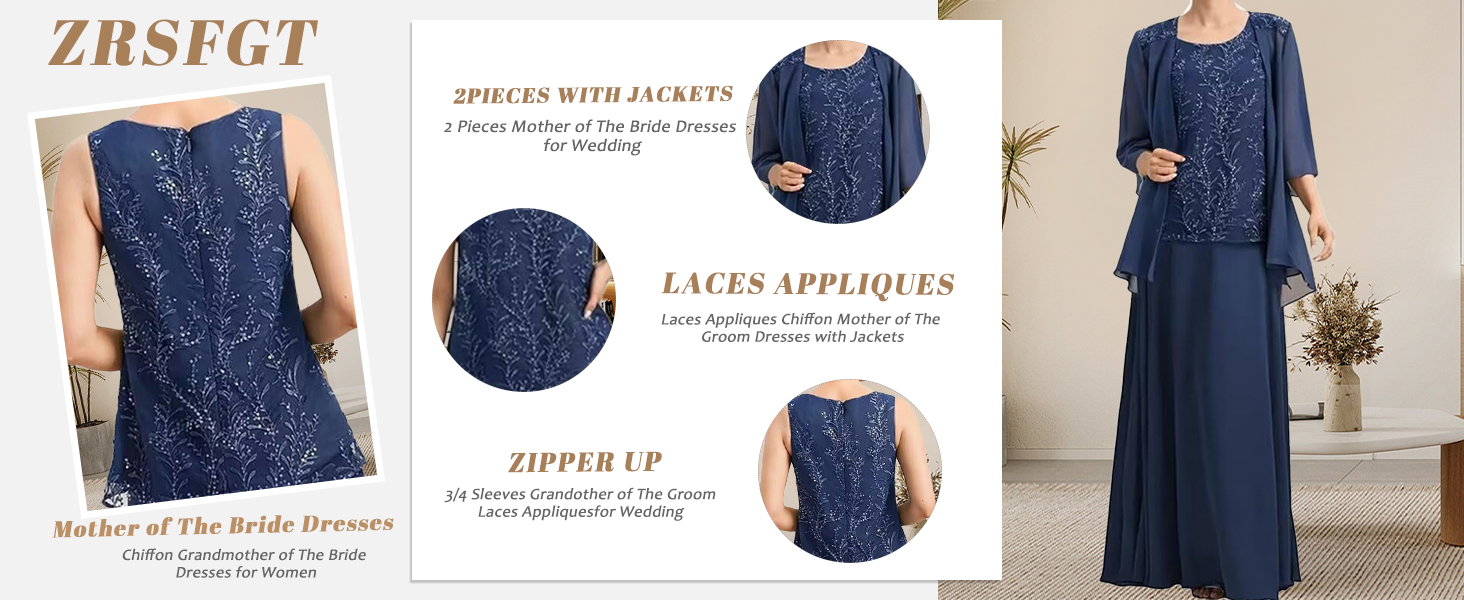 Features:chiffon 3/4 sleeves mother of bride dresses,2 Pieces mother of groom dress ,laces appliques,elegant,zipper,dressy grandmother of bride dress with jackets