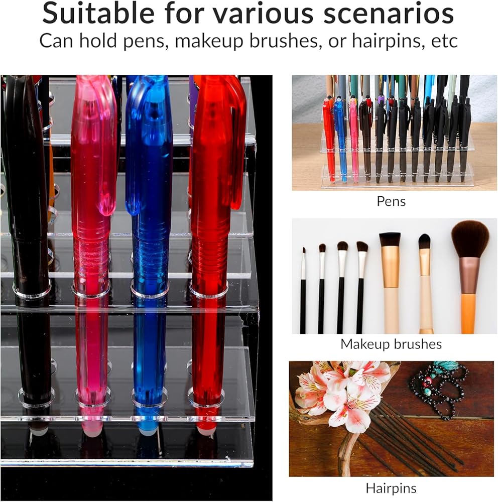 Space-saving Design: No matter where the desk pen holder is placed, this makeup holder's simple yet elegant design captures attention, creating a unique and stylish display for your pens. With the capacity to hold up to 48 pens simultaneously, the pencil organizer offers an efficient solution for organizing your beautiful pens while saving valuable space on any desk or table. The desk pencil holder ensures that your workspace remains uncluttered, allowing you to focus on what truly matters.