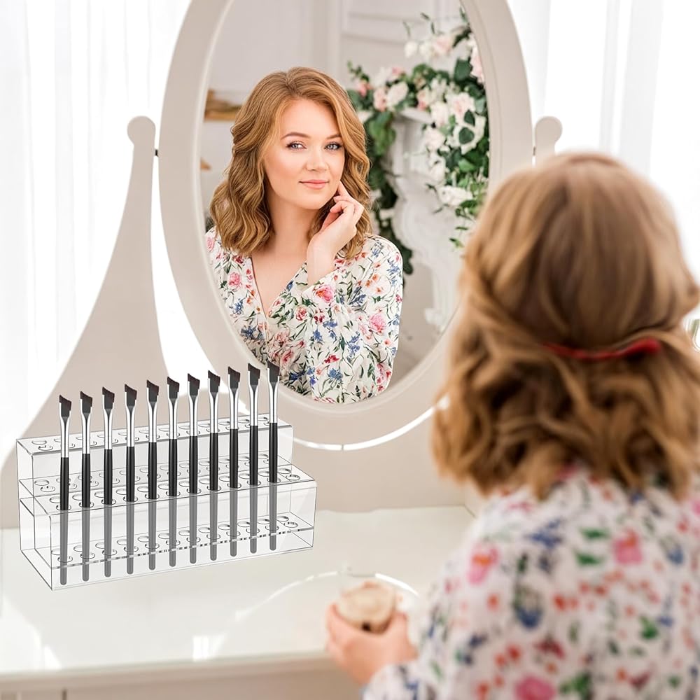 48 Holes Pen Display Stand, Acrylic Pencil Holder for Craft Shows, Clear Makeup Brush Rack, Beaded Eyebrow Art Brush Organizer, Makeup Tool Organizer for School Office Home Retail Store