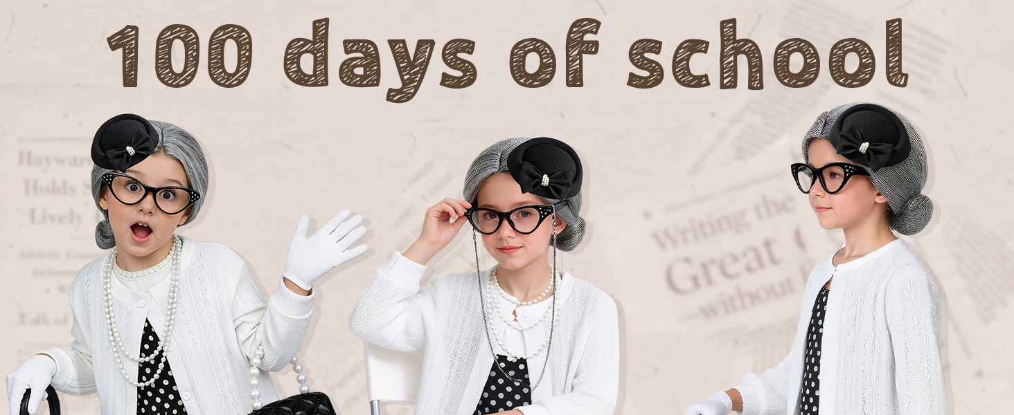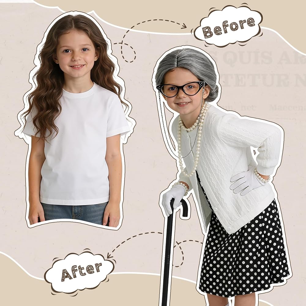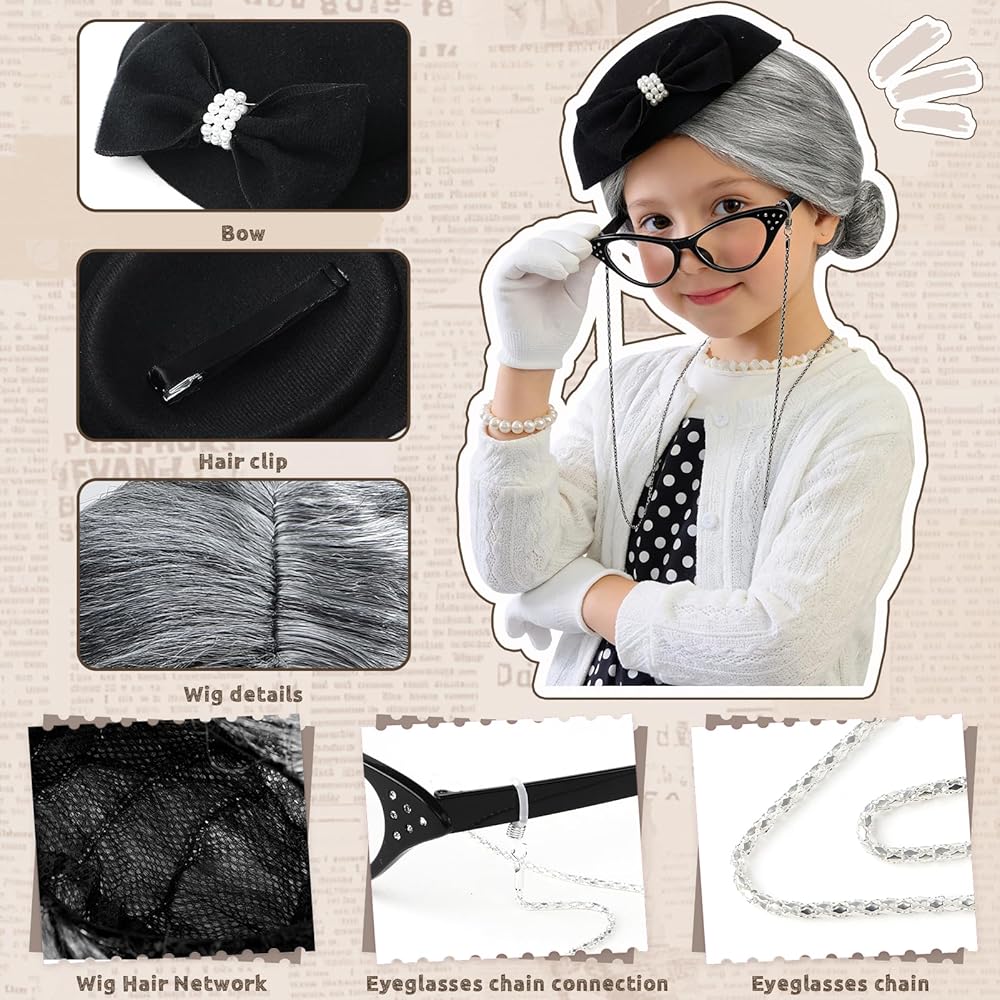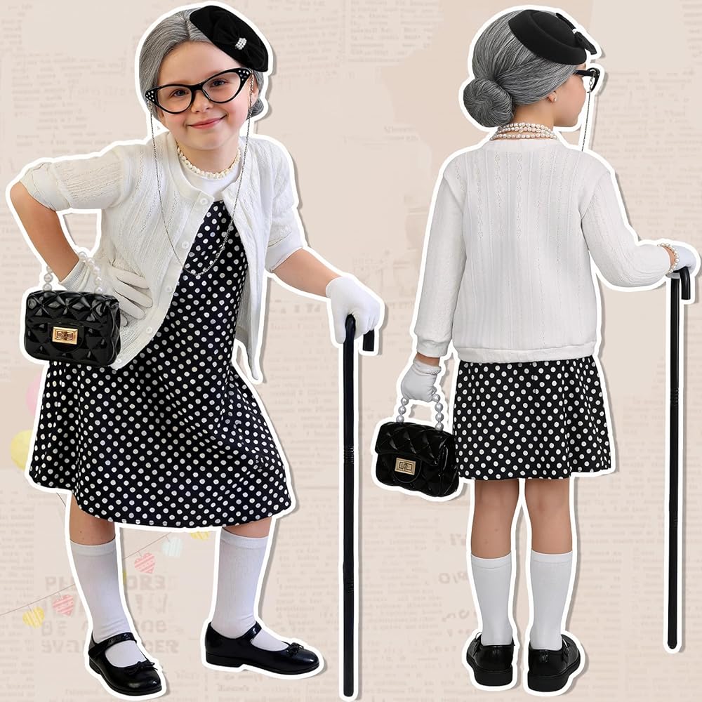 16PCS Old Lady Costume Set For Kids: Complete 16pcs grandma outfit includes 1 Granny cardigan sweater, 1 black and white polka dot dress,1 bag,1 elegant pillbox hat,1 glasses with chain,1 collapsible cane,1 Grandma wig, gloves,socks,1 bracelet, 1 necklace,1 wig cap&hairpins. Designed for 100th Day of School celebrations; classroom role-playing activities; family themed parties