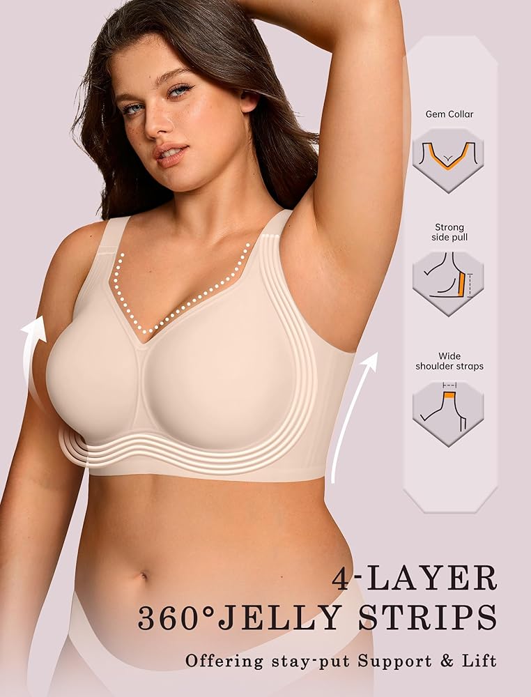 Full Support Bras - These no-wire bras feature a "W-shaped" and innovative 3D supportive technology formed by liquid jelly band, providing full support for your breasts and creating a full, natural-looking chest without the discomfort of a traditional underwire bra. The widened side of the bras with jelly band can effectively conceal excess fat.