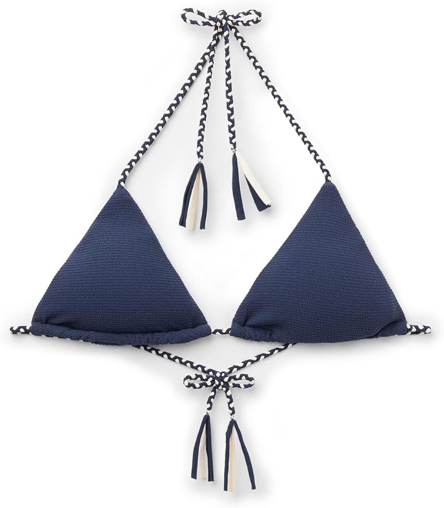 Slide triangle bikini top with removable cups and no underwire for a natural effect. The style is defined by a three-dimensional monochrome fabric with a slightly crinkled texture that adds depth and sophistication. The shoulder straps and the back string tie closure feature a two-toned braid.