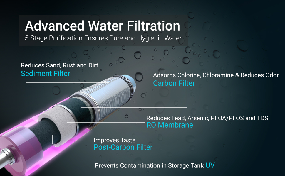 ADVANCED 5-STAGE FILTRATION WITH UV LIGHT -Experience cleaner, safer water with a powerful 5-stage purification system that includes a 0.0001μm RO membrane—engineered to significantly reduce microplastics, heavy metals, and PFAS and PFOS, commonly known as forever chemicals. The built-in UV light not only purifies water but also prevents contamination in the storage tank, ensuring every drop is pure and safe to drink.