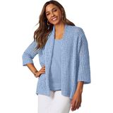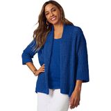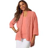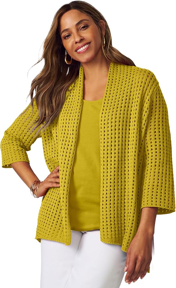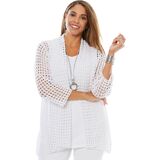 Simple yet elegant, we're bringing back this versatile crochet cardigan. Its open crochet design ensures maximum breathability, making it an ideal layer for warmer weather. Pairs perfectly with our Stretch Cotton Horseshoe Neck Tank. Drop shoulder br> Three-quarter sleeves br> Relaxed Silhouette br> 28" length br> Ramie/cotton br> Machine washable br> Imported