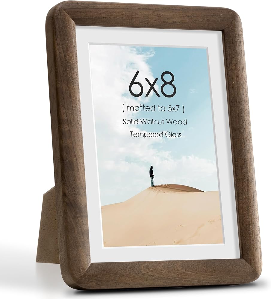 [6x8 PICTURE FRAME] Our 6x8 frame is meticulously constructed using natural Walnut wood, known for its timelessness and durability. The slim profile of the 6x8 photo frame effortlessly blends into any interior decor, adding a contemporary touch. The clean lines and sleek design make the photo frames 6x8 a great choice for those seeking a stylish, understated display solution.