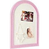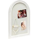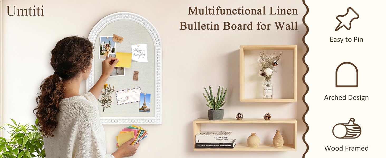 Sleek and Minimalist Design : The pin board has a white wooden frame with rounded corners and a fabric that looks like linen. The graceful arch shape adds a touch of art to the wall while keeping a clean and open look