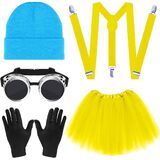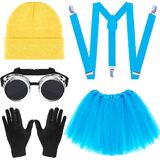 6 PCS Adults Yellow Costume Accessories for Women, Adults Yellow Beanie/ Goggles/ Gloves/ Suspenders/ Blue Tutu for 100th Days of School Cosplay Dress Up