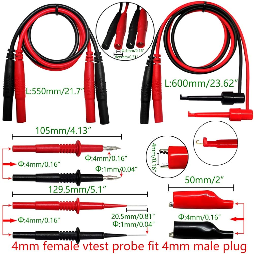1) Two ( One red + one black) 32 inch silicone rubber wire lead extensions, Shrouded banana plugs at both ends, Whole length: 82cm (32.22 inch)