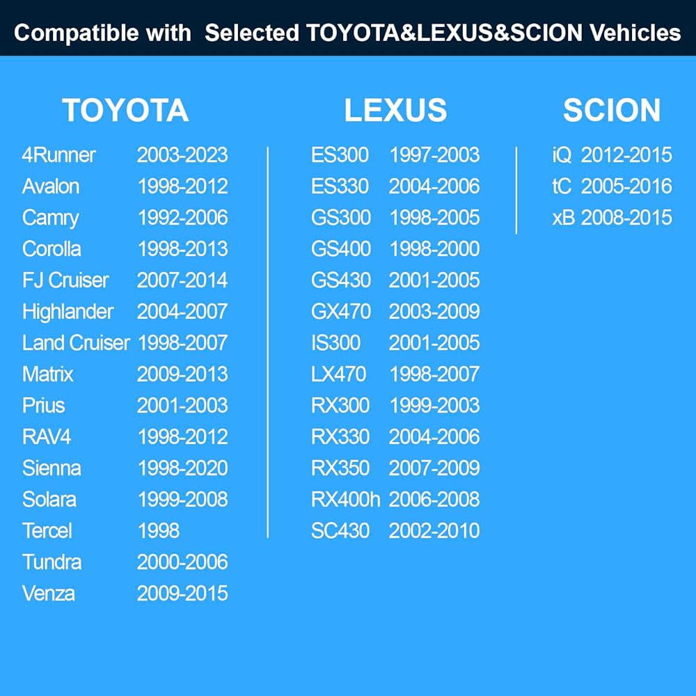 - Compatible with TOYOTA Vehicles: 2003-2023 4Runner| 1998-2012 Avalon| 1992-2006 Camry| 1998-2013 Corolla| 2007-2014 FJ Cruiser| 2004-2007 Highlander| 1998-2007 Land Cruiser| 2009-2013 Matrix| 2001-2003 Prius| 1998-2012 RAV4| 1998-2020 Sienna| 1999-2008 Solara| 1998 Tercel| 2000-2006 Tundra| 2009-2015 Venza