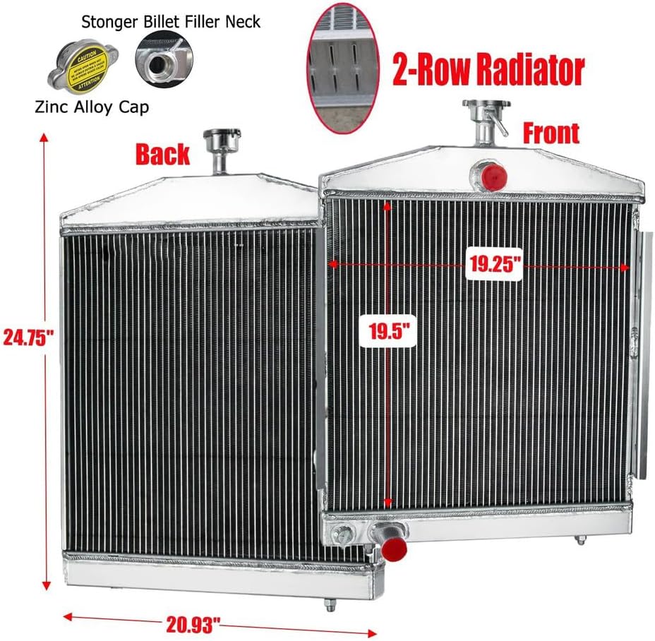 • Core Size: 19.2'' x 19.2''; Overall Size: 28.5'' x 21.1''. Inlet: 1.5'', Outlet: 1.5''. High performance racing spec. 2 row core aluminum radiator