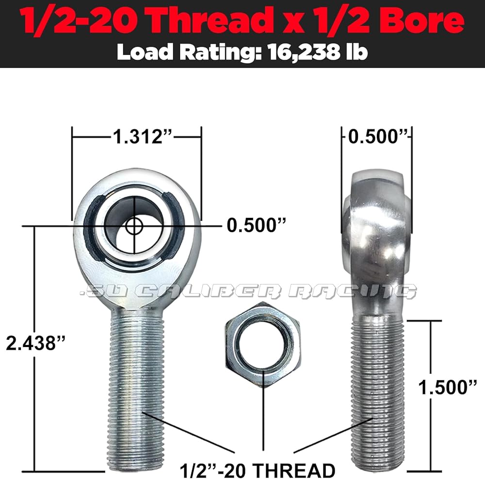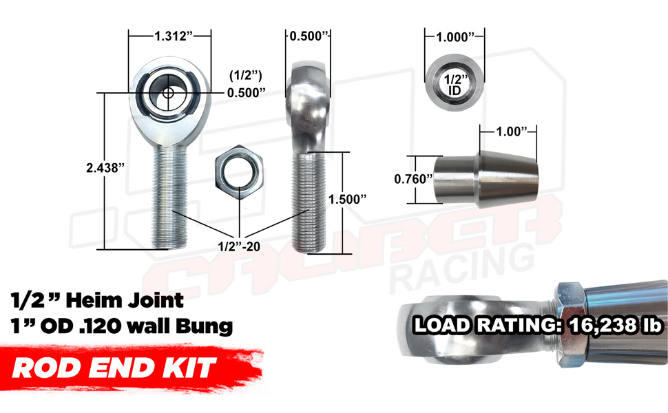PRODUCT SPECIFICATIONS: Heim joints: 1/2"-20 Thread x 1/2" ● Bungs: 1" OD x .120" Wall x 0.76" ID ● Total Assembled Width: 1.375" ● Static Load Rating: 16,238 lb