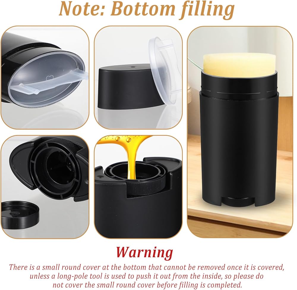 Switch-on Design, Bottom Filling: Each plastic deodorant containers comes with a rotating knob; simply rotate the bottom to easily adjust. Fill directly through the hole at the bottom of the container; never fill from the top. Do not overfill; after the liquid has solidified/cooled, replace the included round cap.