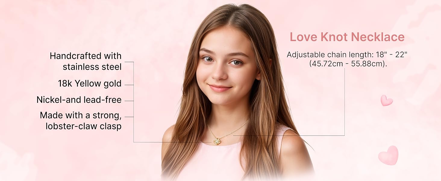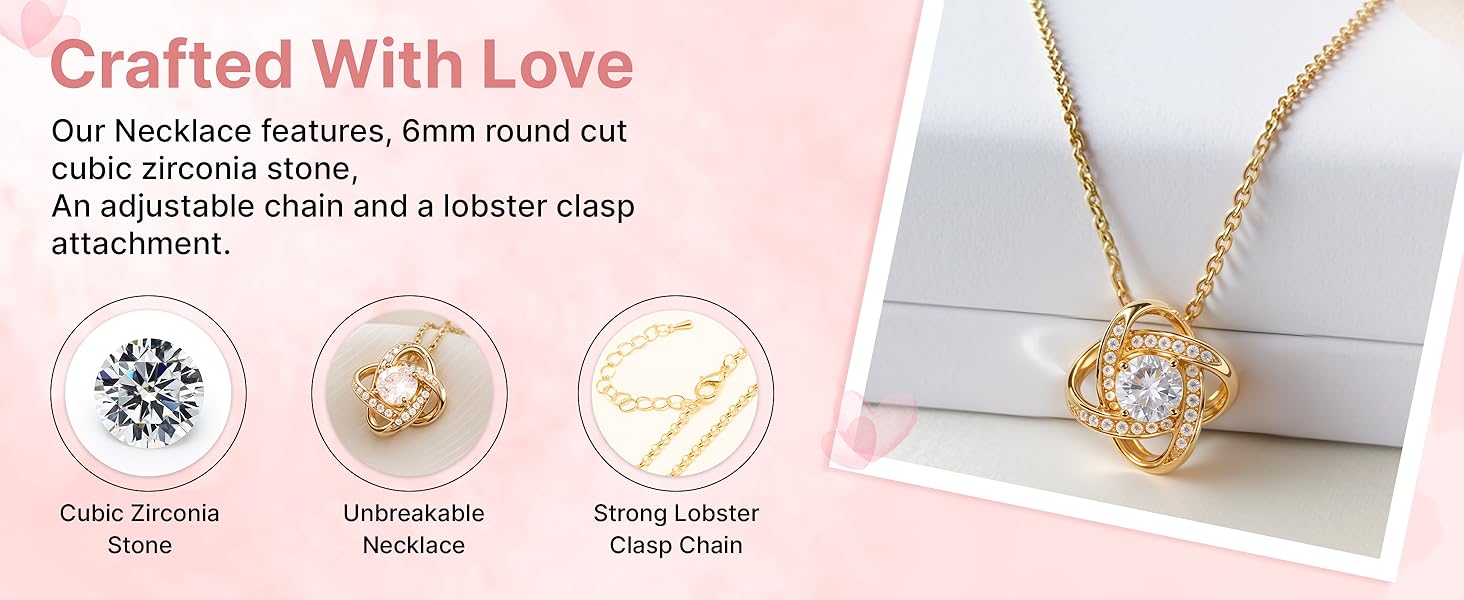 Imagine her reaction receiving this beautiful Love Knot Necklace. Representing an unbreakable bond between two souls, this piece features a beautiful pendant embellished with premium cubic zirconia crystals. Surprise your loved one with this gorgeous gift today! 14k white gold over stainless steel or 18k yellow gold over stainless steel. 6mm round cut cubic zirconia stone. Pendant dimensions: 0.6" (15.7mm) height / 0.23" (6mm) width. Adjustable chain length: 18" - 22" (45.72cm - 55.88cm). Lobster clasp attachment. Your piece is lovingly packaged in a complimentary soft touch box for easy gifting. Elevate your presentation by upgrading to the mahogany style luxury box, which features a brilliant LED spotlight.