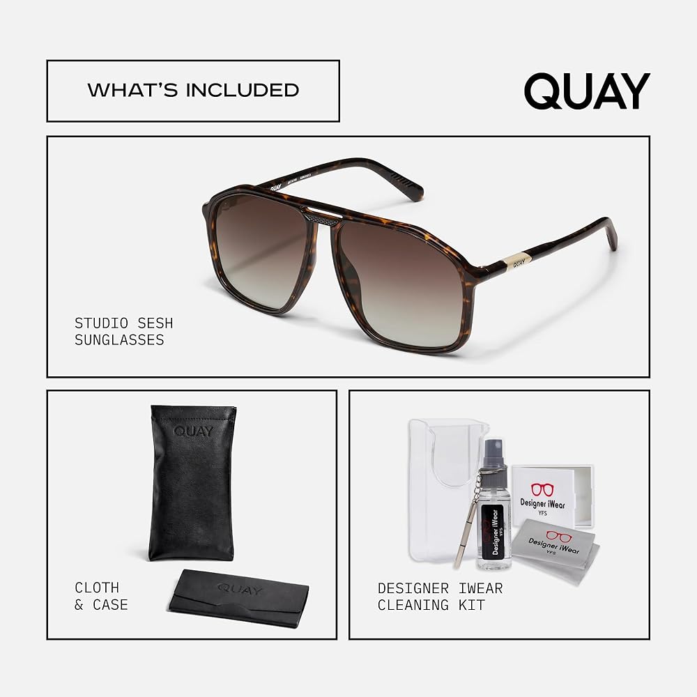 Quay Studio Sesh Sunglasses: Turn up the volume with the Quay Studio Sesh, featuring an oversized navigator frame, tubular arms, and metal bridge detail. This unisex style delivers bold, confident looks with all-day comfort—perfect for sunny streets, festivals, or making a statement wherever you go.