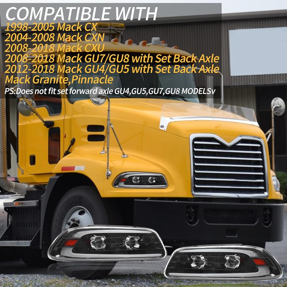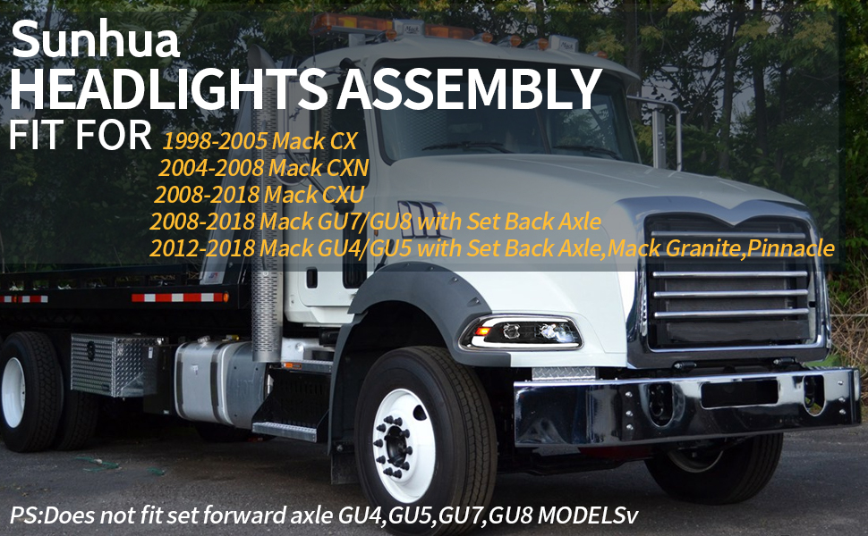 【Fitment】 LED DRL Headlights assembly Compatible with 1998-2005 Mack CX,2004-2008 Mack CXN,2008-2018 Mack CXU,2008-2018 Mack GU7/GU8 with Set Back Axle,2012-2018 Mack GU4/GU5 with Set Back Axle,Mack Granite,Pinnacle,PS:Does not fit set forward axle GU4,GU5,GU7,GU8 MODELS.
