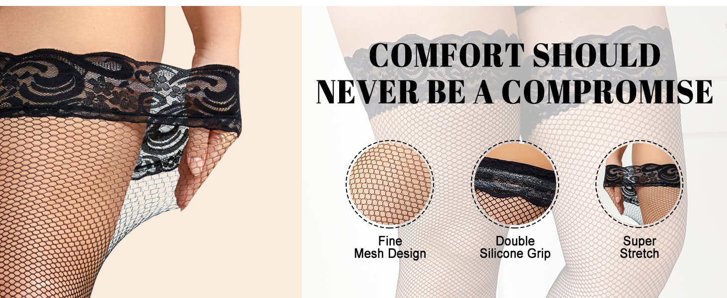 Stay-Up Technology & Comfort: Features a non-slip silicone band at the top that gently grips your thighs without leaving marks, providing reliable stay-up support all day or night. The seamless and textured fishnet construction ensures a smooth, durable feel.