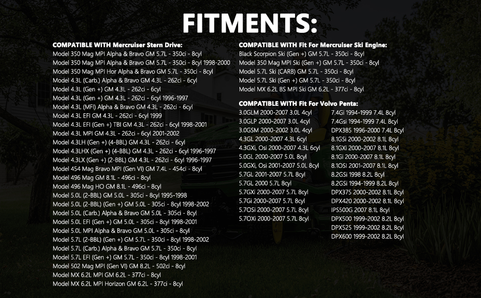 • 【Vehicle Fitment】Effoexparts starter motor compatible with Volvo Penta Engines 3.0L 4.3L 5.0L 5.7L 6.2L 7.4L 8.1L 8.2L DPX375 DPX385 DPX415 DPX420 DPX500 DPX525 DPX600 IPS500G1989-up / Mercruiser Stern Drive Engines 4.3L 5.0L 5.7L 454 - 496 - 502 Mag 1998-up / Mercruiser Ski Engine 350 Mag 5.7L 6.2L