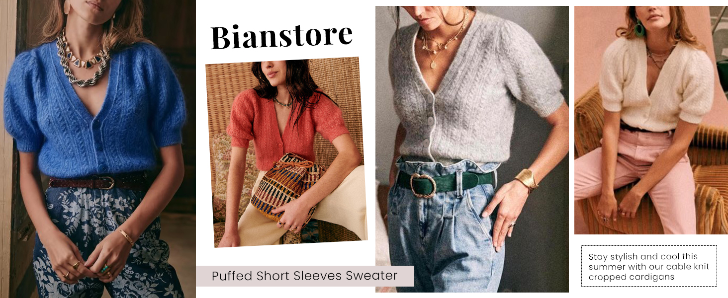 Bianstore Women's Puff Short Sleeve Sweater Casual V Neck Cardigan Tops Ribbed Knit Button Down Shirts(Blue-M)