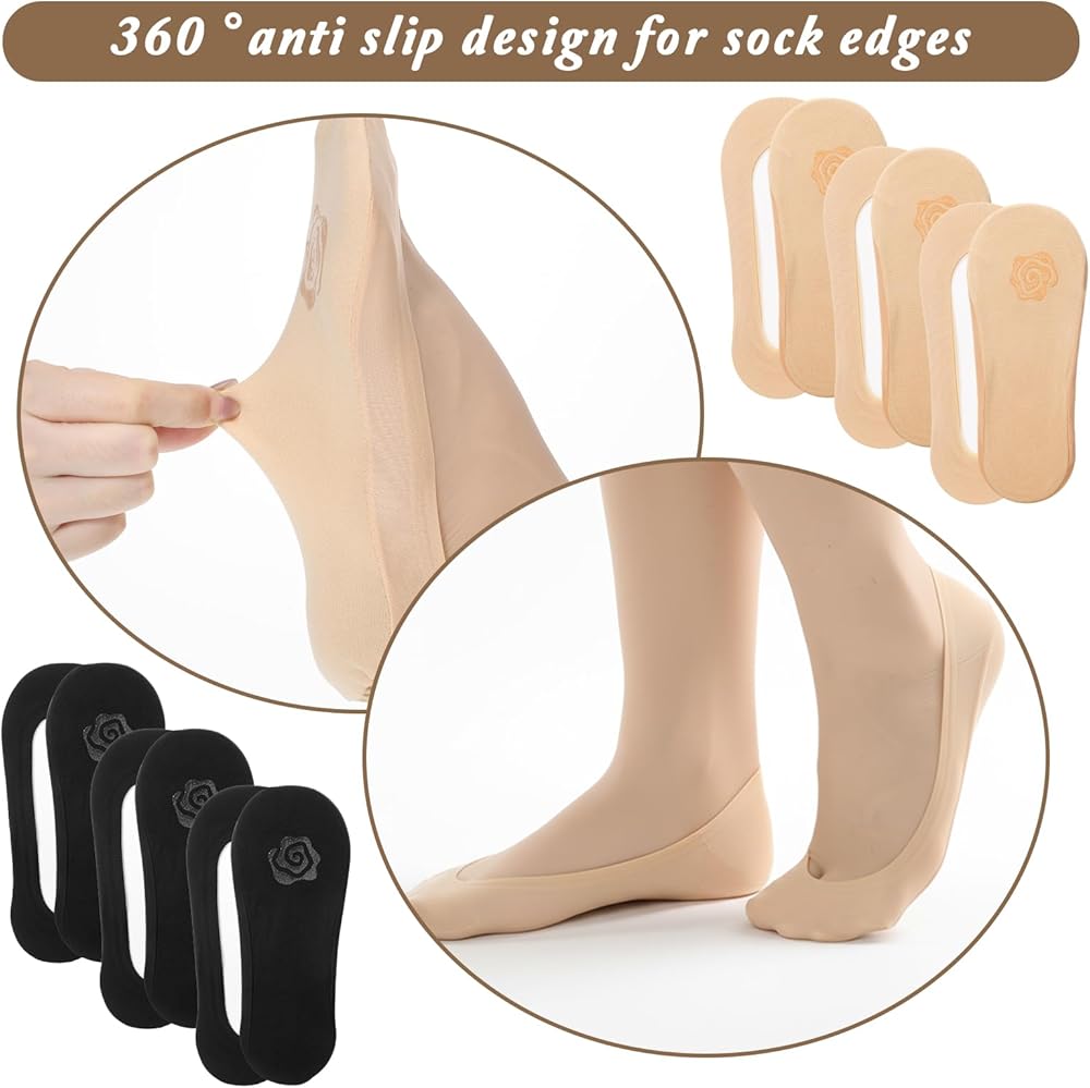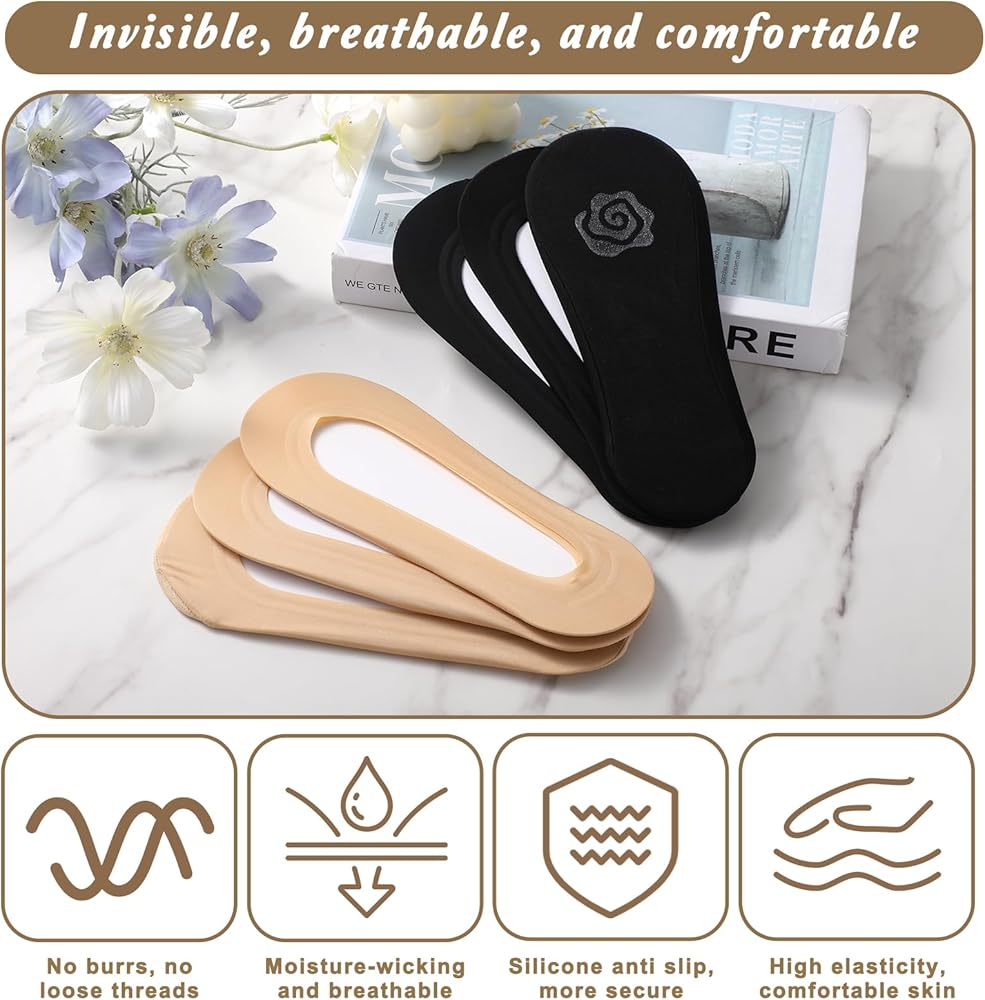 【Package Contents】You will receive 6 pairs of low-top non-slip socks, 3 pairs of skin color and 3 pairs of black. The stretchy fabric accommodate foot sizes 5-9, offering a snug yet non-constricting fit.