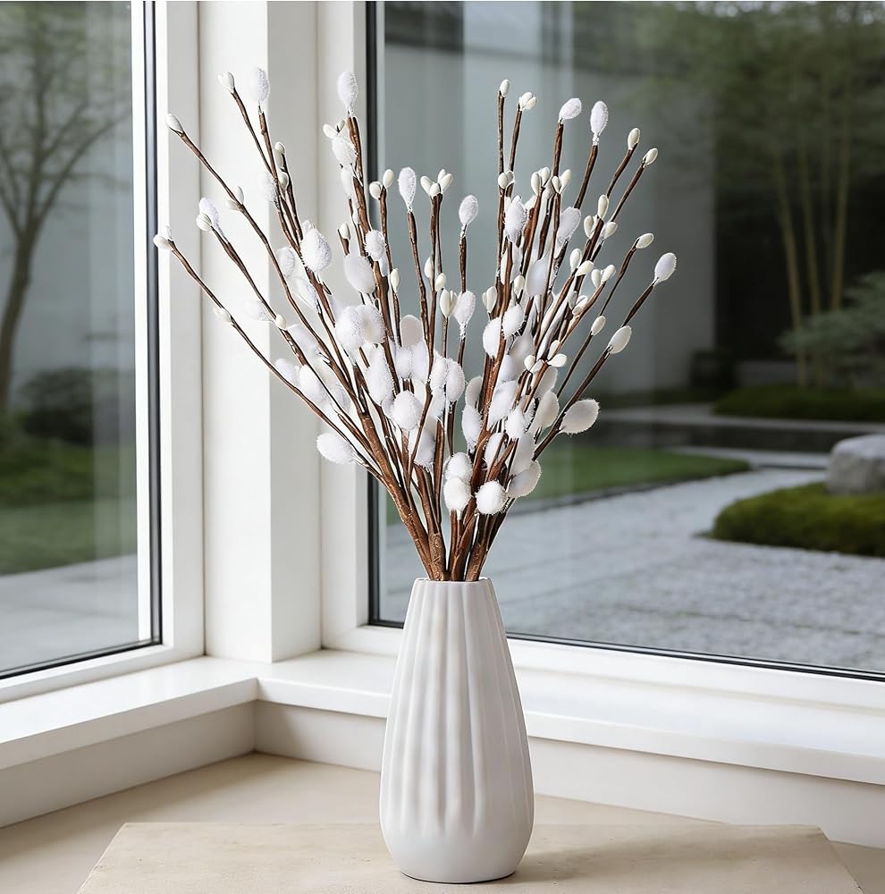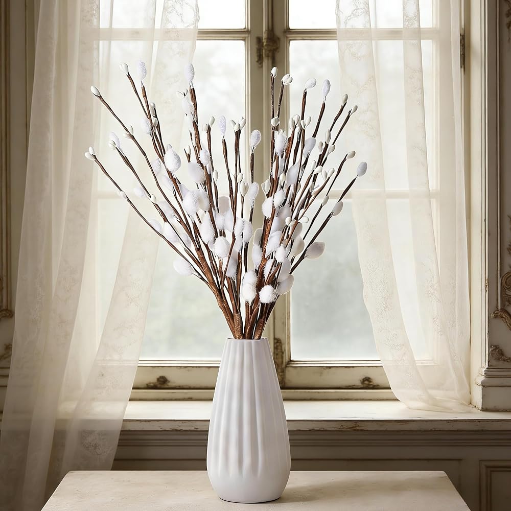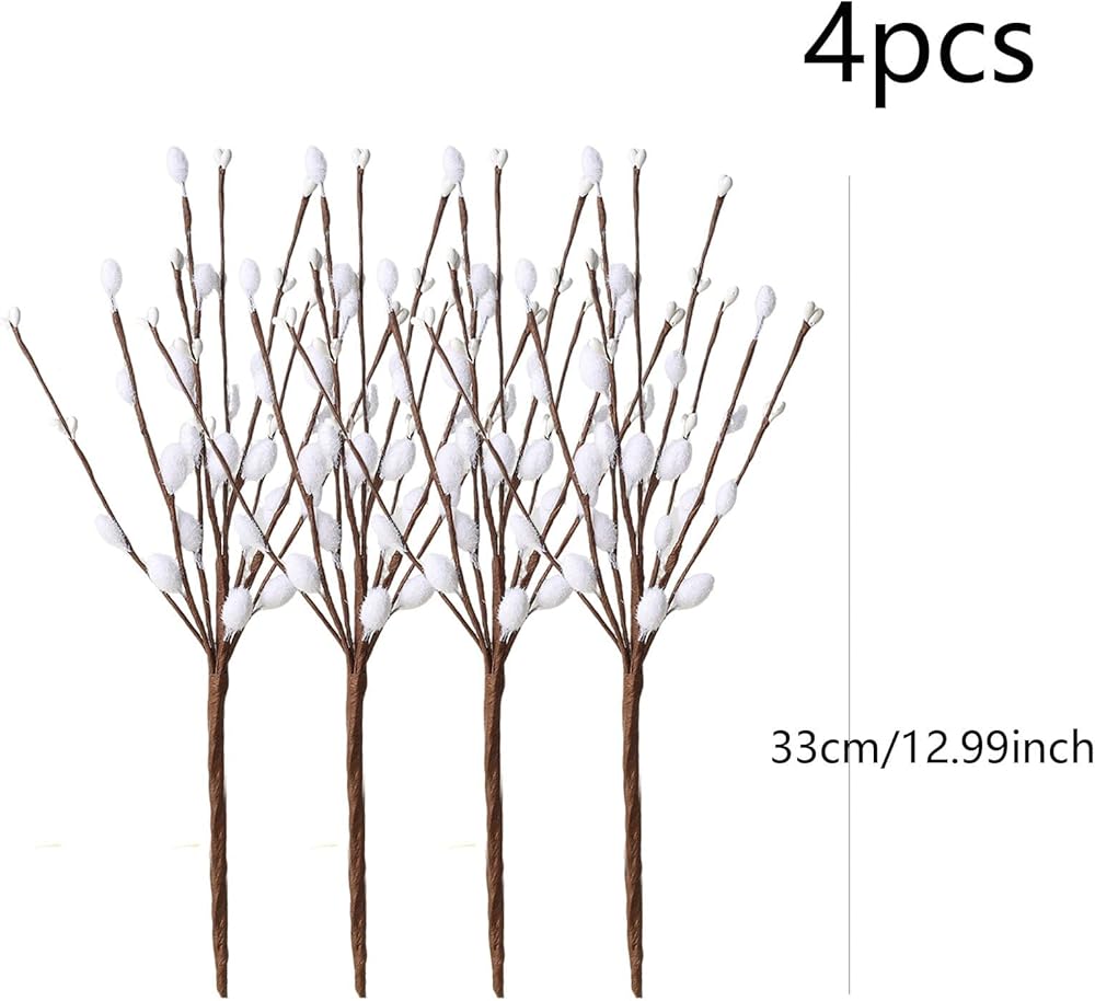 Artificial Pussywillow Branches:Each pack contains 4 independent white flower branches, with a height of 12.99 inches (33cm). The flower buds of these white willow branches are made of fluff material, and the touch and visual effects are highly restored to the real willow.