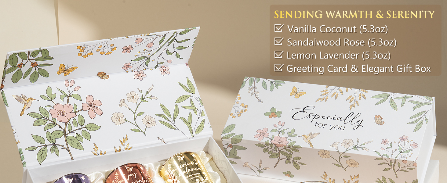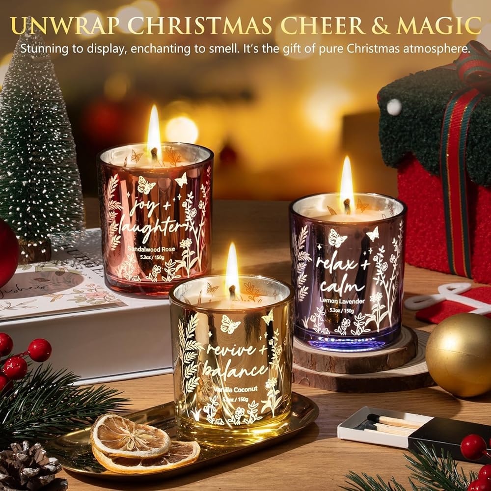 PERFECT CANDLE SETS FOR WOMEN GIFT: Meticulously crafted for those who cherish warmth, luxury & festive cheer, this exquisite soy candles gifts set include 3 x 5.3oz scented candles with different flavors, a decent gift card & an elegant gift box. Each candle exudes enchanting scent, offering a unique sensory experience and creating a celebratory atmosphere. Can be a nice birthday Christmas gifts for women, mom, grandma, sister, wife, best friends, teacher, nurse, coworker, boss, colleague, etc