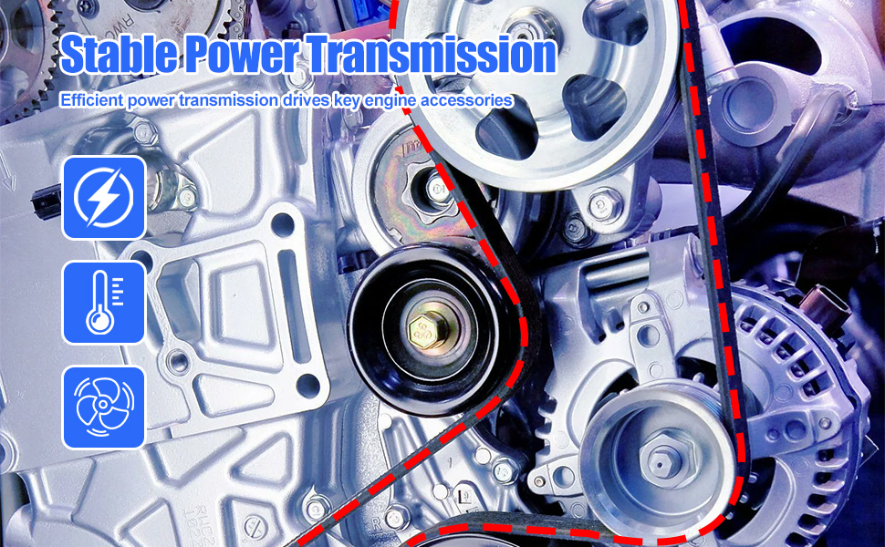 Stable Power Transmission: Belt connects various engine accessories, achieving efficient power transmission and ensuring smooth operation of components such as alternator, water pump, and air conditioning compressor, maintaining stable performance of vehicle auxiliary systems