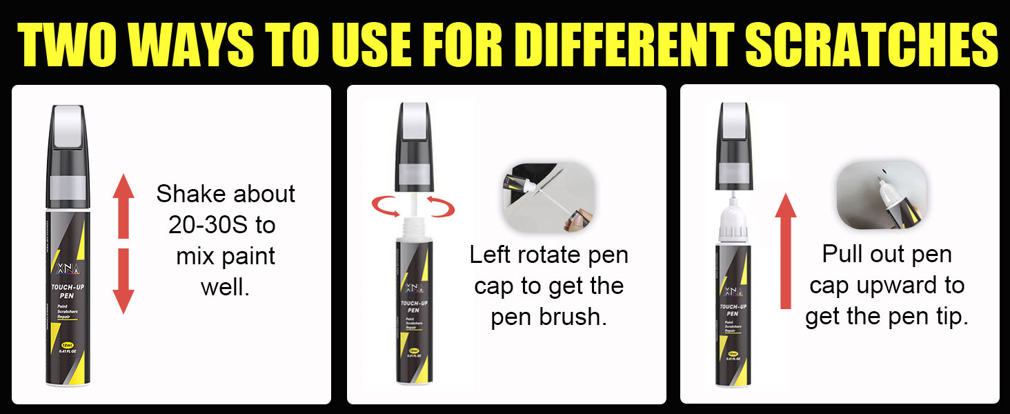 [Easy to Repair] 1. Clean the scratched area; 2. Shake the car paint pen for 20-30 seconds to mix the paint fully; 3. Apply small amounts multiple times in the same direction. For deeper scratches, wait 5 to 10 minutes for the paint to dry, remix the car touch-up paint, and repeat until the damaged area is fully covered.