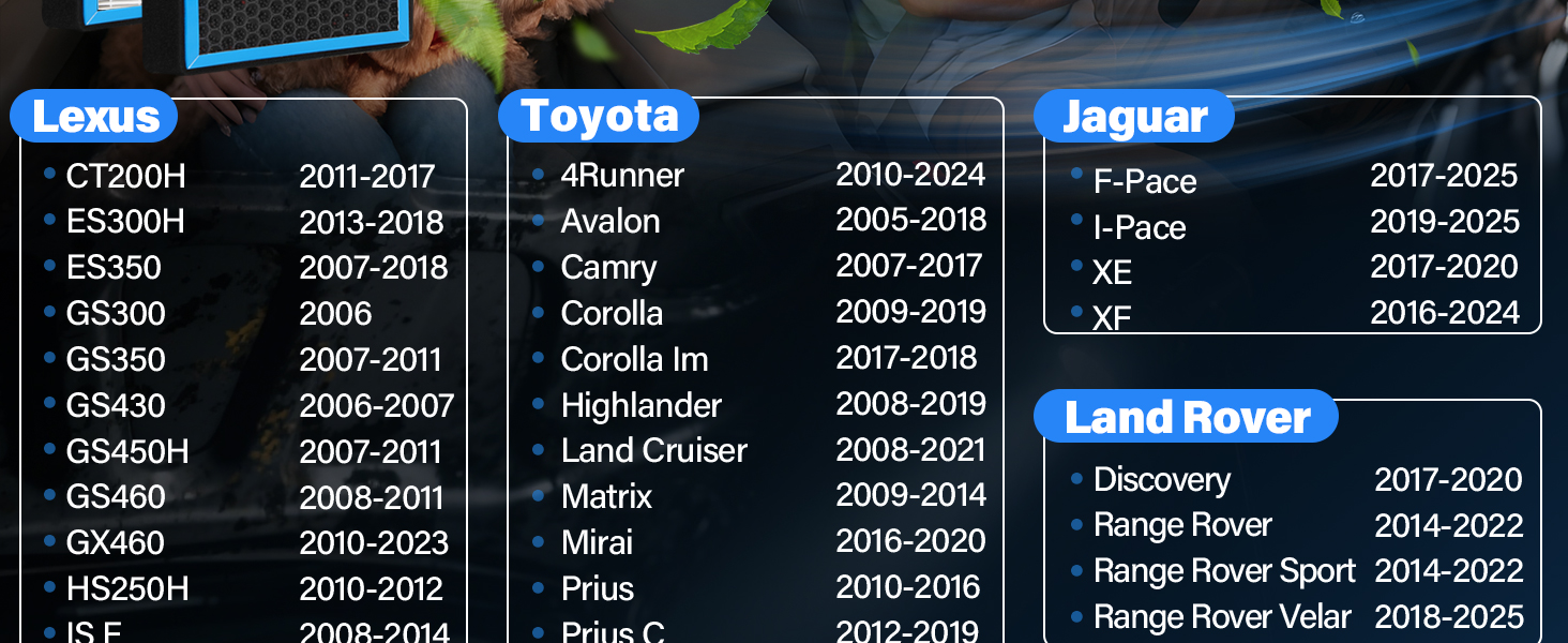【Compatible With Toyota】Activated Carbon HEPA Compatible With 4Runner (2010-2024), Avalon (2005-2018), Camry (2007-2017), Corolla (2009-2019), Corolla Im (2017-2018), Highlander (2008-2019), Land Cruiser (2008-2021), Matrix (2009-2014), Mirai (2016-2020), Prius (2010-2016), Prius C (2012-2019), Prius Plug-In (2013-2015), Prius V (2012-2018), Rav4 (2006-2018), Sequoia (2008-2022), Sienna (2011-2020), Tundra (2007-2021), Venza (2009-2016), Yaris (2006-2018).