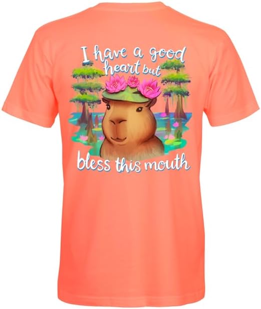 Add a playful touch to your casual wardrobe with this charming Southern Attitude t-shirt featuring an adorable capybara design. The bright coral color serves as the perfect backdrop for the whimsical artwork of a flower-crowned capybara surrounded by a dreamy woodland scene, complete with the humorous text 'I have a good heart but bless this mouth.' Made from soft cotton fabric, this short-sleeve t-shirt combines comfort with Southern sass. The classic crew neck and relaxed fit make it ideal for everyday wear, while the signature Southern Attitude logo on the chest adds an authentic touch. Perfect for those who appreciate a blend of cute and sassy style, this t-shirt makes a statement while keeping you comfortable. The vibrant coral shade pairs easily with jeans, shorts, or casual bottoms for a complete look that's both eye-catching and fun.