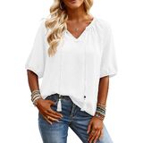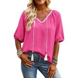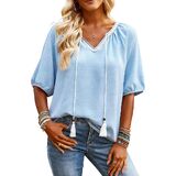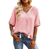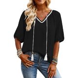 Tassel Tie Front V Neck Top:The V-neck design is flattering and provides a relaxed fit that's perfect for everyday wear. The drawstring detail allows for a customized fit and adds a stylish element to the blouse.it's baggy enough to tuck in or tie