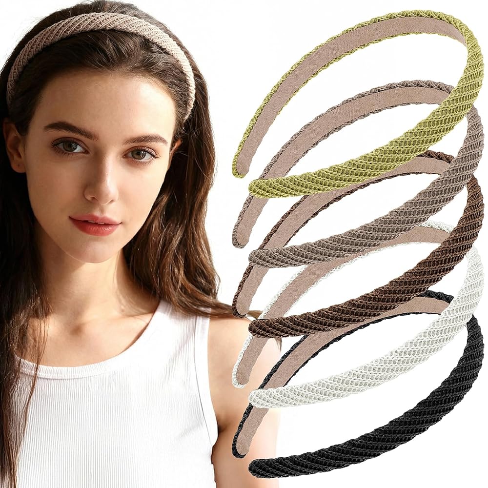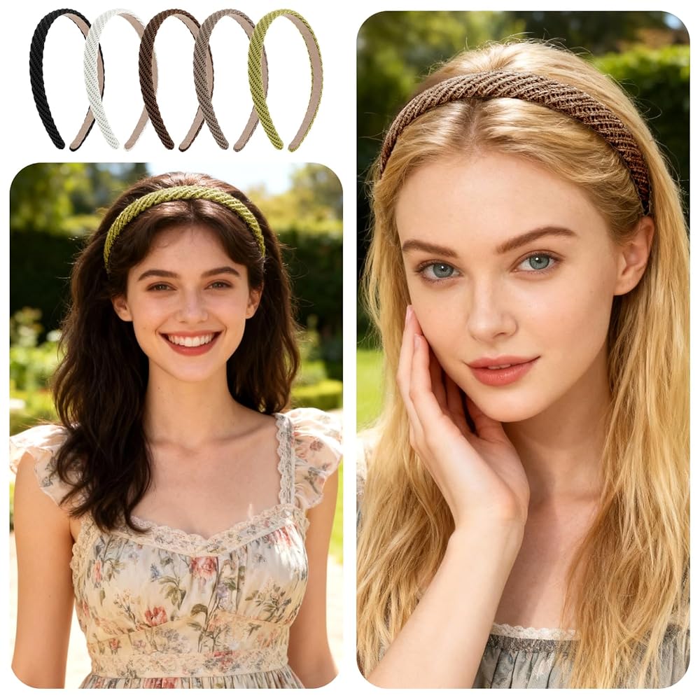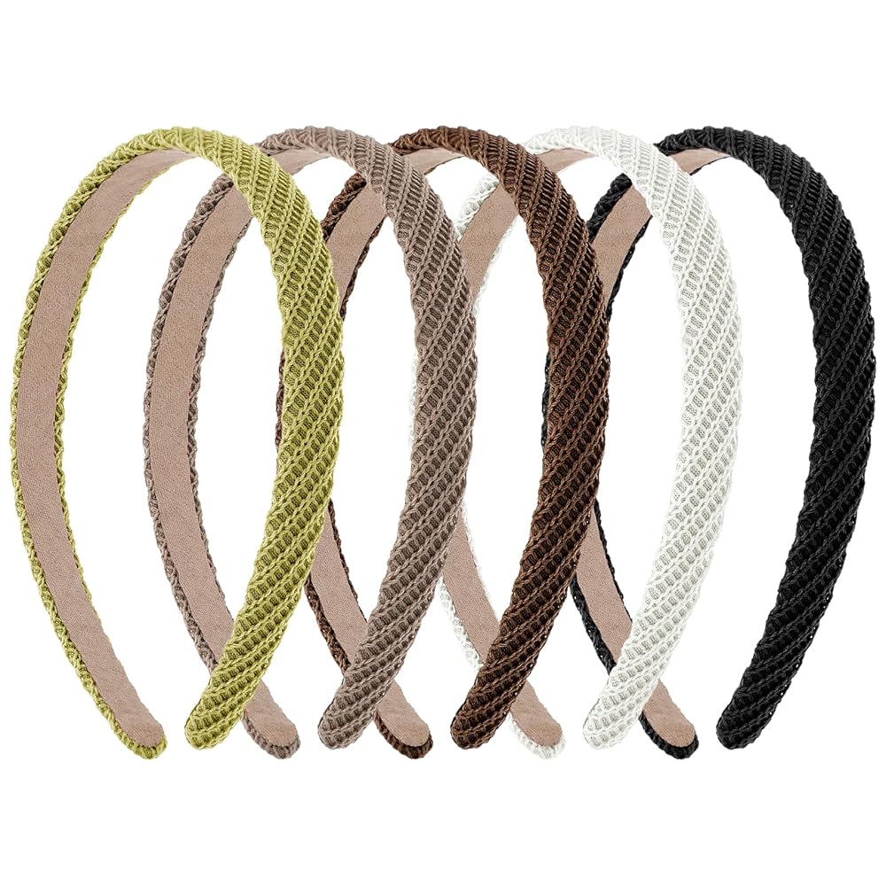 5Pcs Thin Headbands for Women Thin Knitted Hairbands Fashion Non Slip Headband Vintage Boho Head Bands for Women's Hair Cute Solid Colors Hair Accessories (Black, White, Khaki, Coffee, Yellow-green)