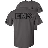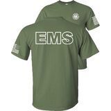 The Emergency Medical Services EMS design is on the back, a small print on the front left chest and a Backwards American Flag on the right sleeve.