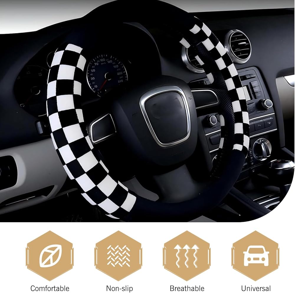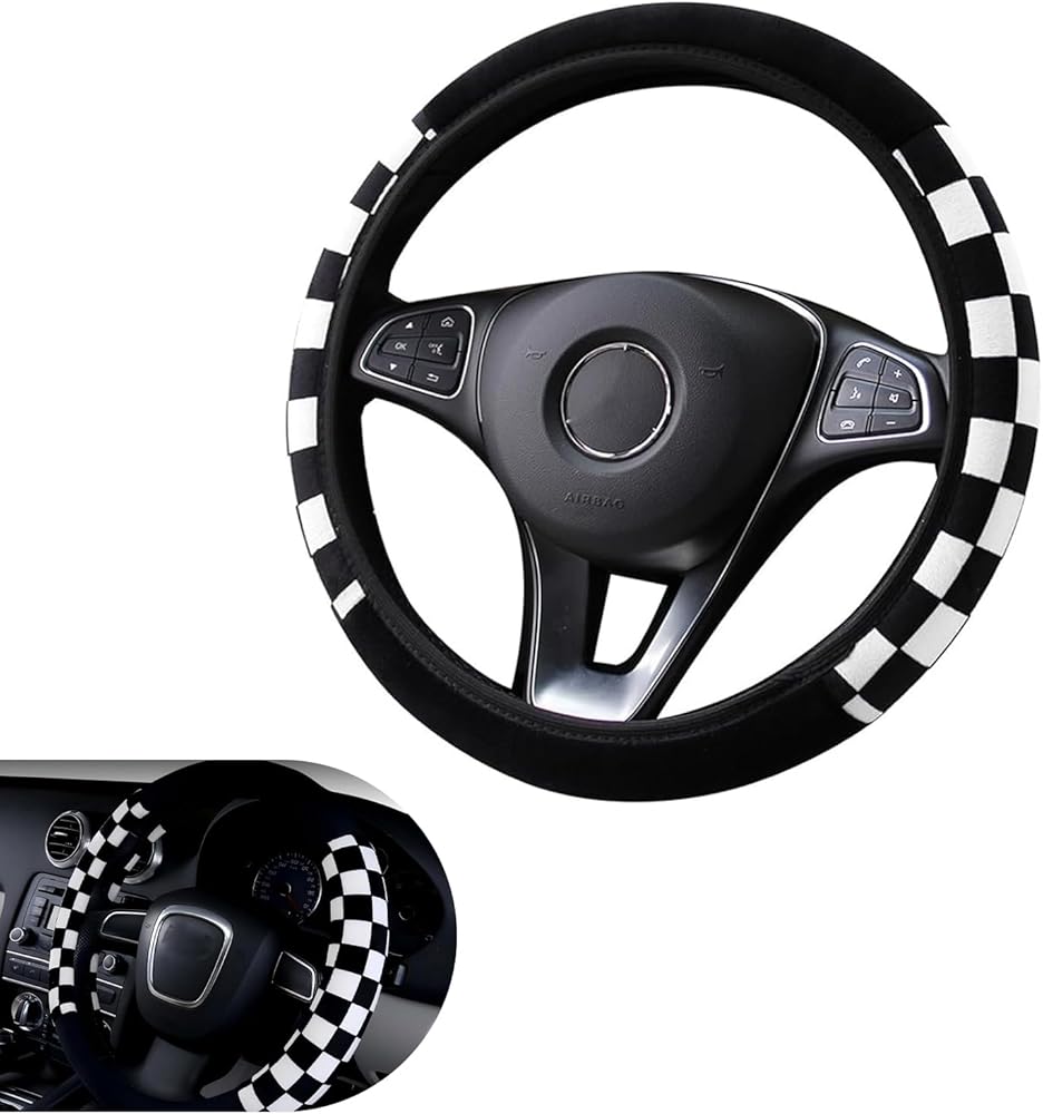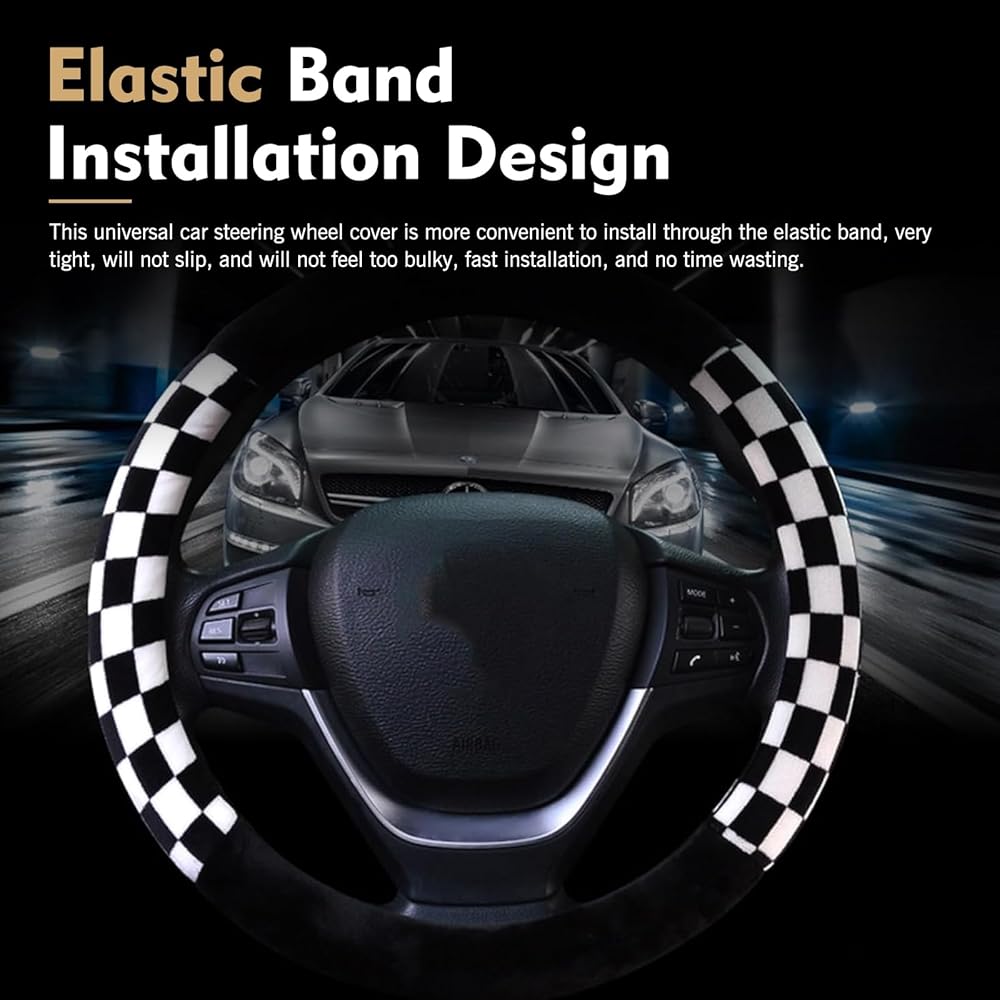 Foelony Black and White Checkered Plaid Soft Wheel Cover, Non-Slip Fluffy Keep Warm Steering Wheel Protector Decor, Universal for 14.5-15 Inch Car Truck SUV (Black & White)