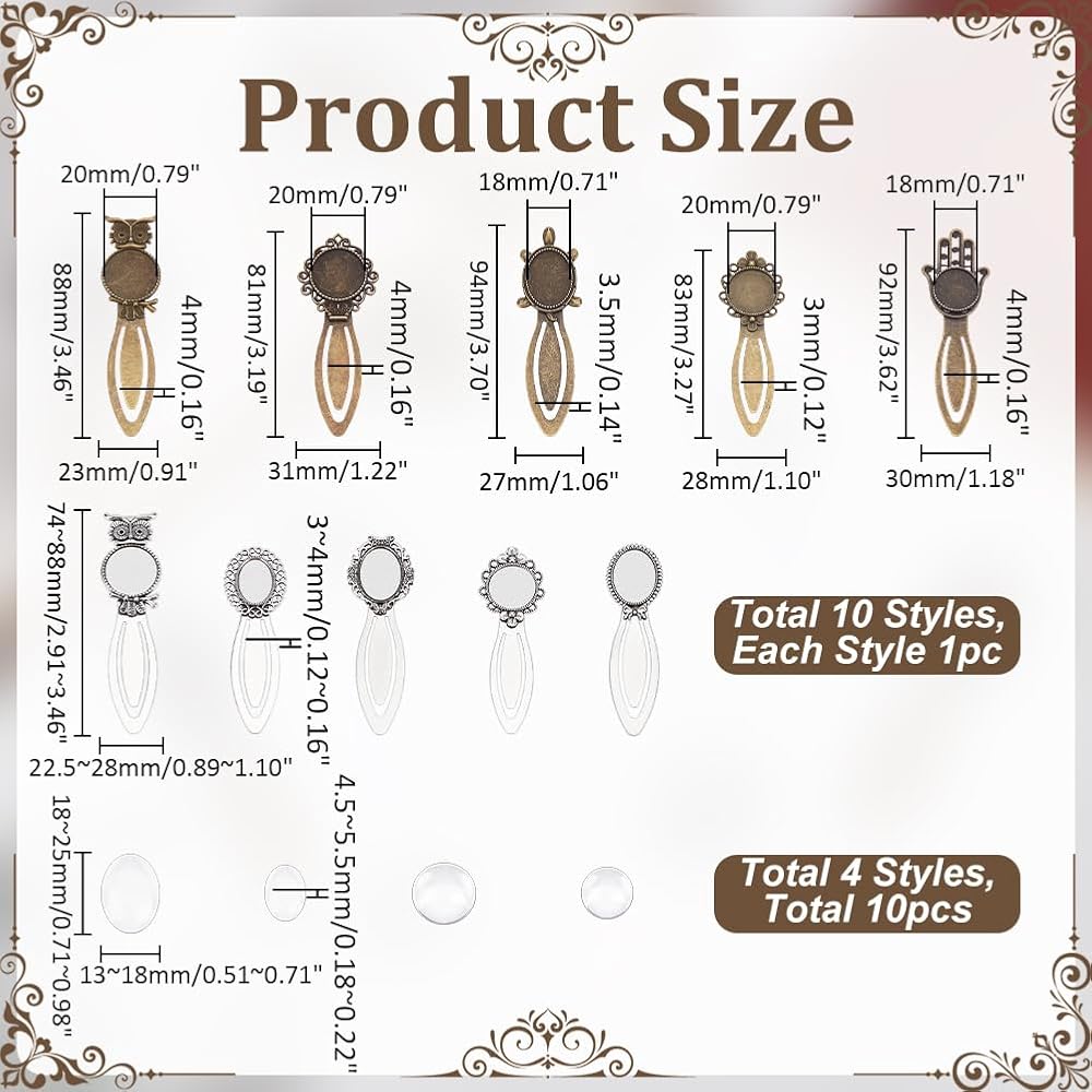 20Pcs 10 Styles Vintage Bookmark Pendant Tray Kit Include 10Pcs Oval Round Metal Bookmark Cabochon Setting with 10Pcs Clear Glass Cabochon Alloy Cabochons Book Mark Blank Bezels