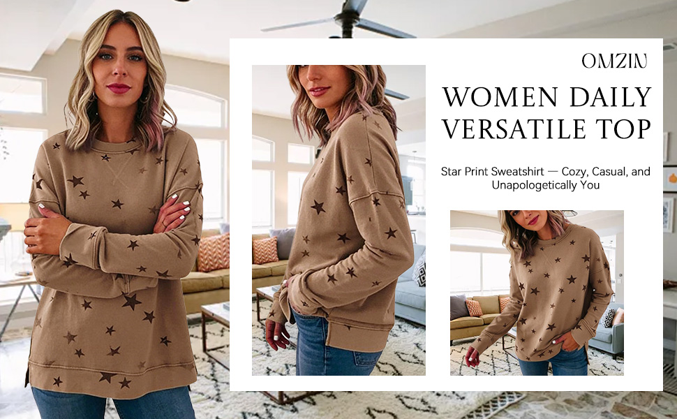 Feature: Women Casual Pullover Sweatshirt, Crew Neck, Long Sleeve, Cute Star Pattern, Side Slit, Casual Simple and Never Outdated.