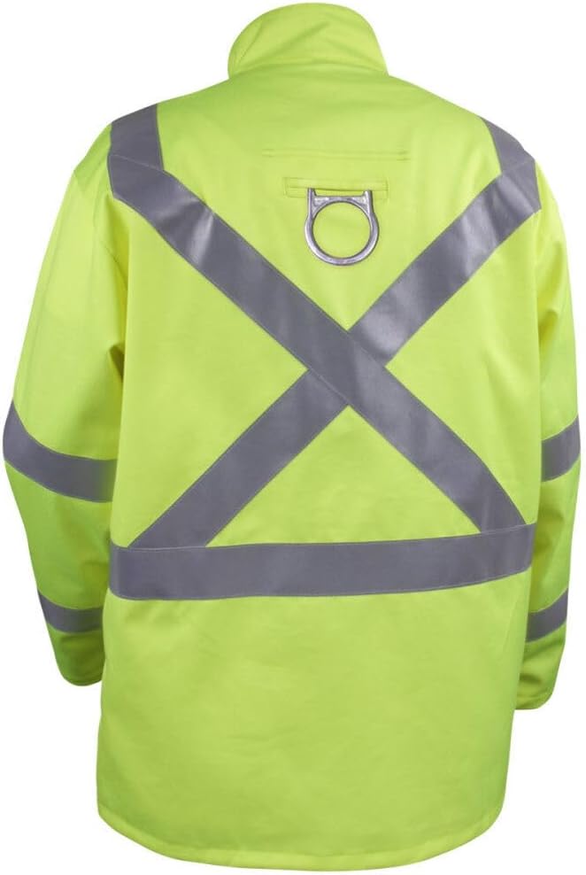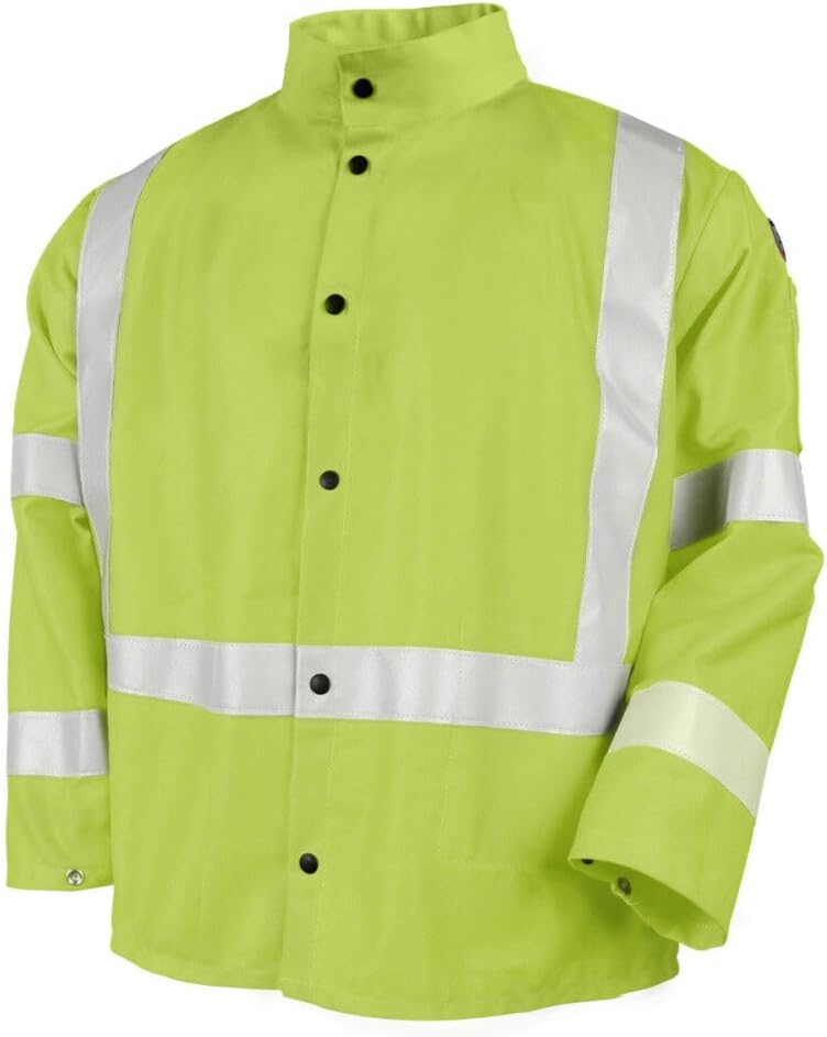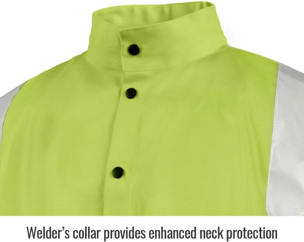The Black Stallion JF1012-LM Safety Lime 9 oz. FR Cotton Safety Welding Jacket with FR Reflective Tape is ideal for light welding applications where being "seen" is critical, like construction, traffic zones, etc. 2" silver reflective tape forms a "X" reflective tape pattern on back and also is wrapped around the chest and arms, enhancing the wearer's visibility. The standup Welder's collar helps protect neck, while the back access slot allows pass-through of fall protection harness. The JF1012-LM also has one inside pocket, one scribe pocket, and snap front and wrists. With over 50 years of innovation and manufacturing experience, Black Stallion continues to lead the market in high-quality, innovation-driven, and value-added gloves, fire-resistant (FR) garments and other personal protective equipment (PPE). Our commitment to user-centric design, consistent quality, and best-practice manufacturing processes ensures our position as one of the best solutions for distributors in the welding, industrial, safety, oil & gas, mining, electrical & utility, and construction markets.