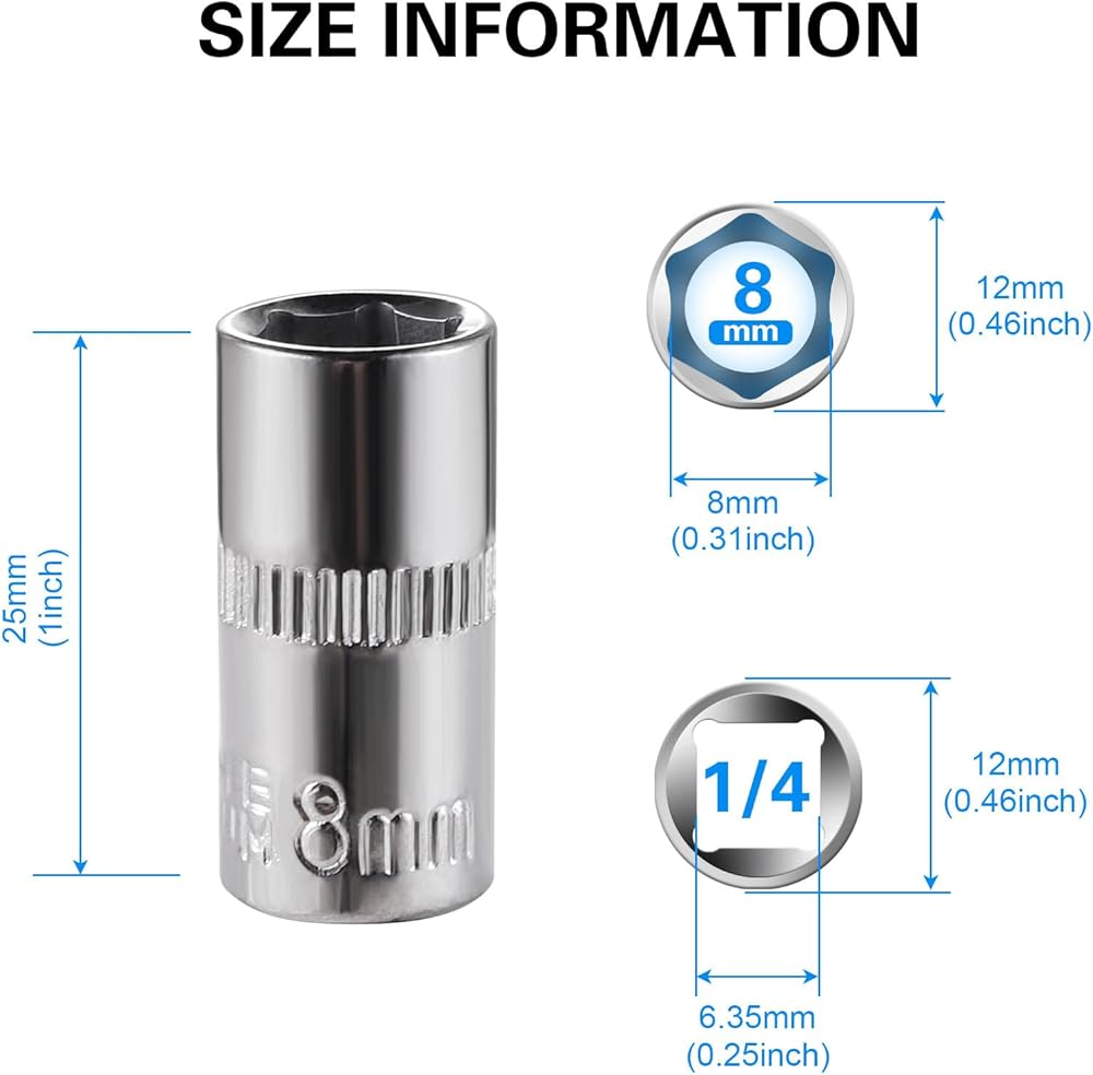 These 8mm socket sets are made from Crestoloy alloy steel, sturdy and durable. The Shallow Socket Has Full Polish Chrome Finish is corrosion-resistant and has a longer lifespan. It is widely used in fields such as car repair, DIY finishing, woodworking, home maintenance, and construction engineering. 1/4 size, Shallow body allows sockets to fit into tight, narrow spaces