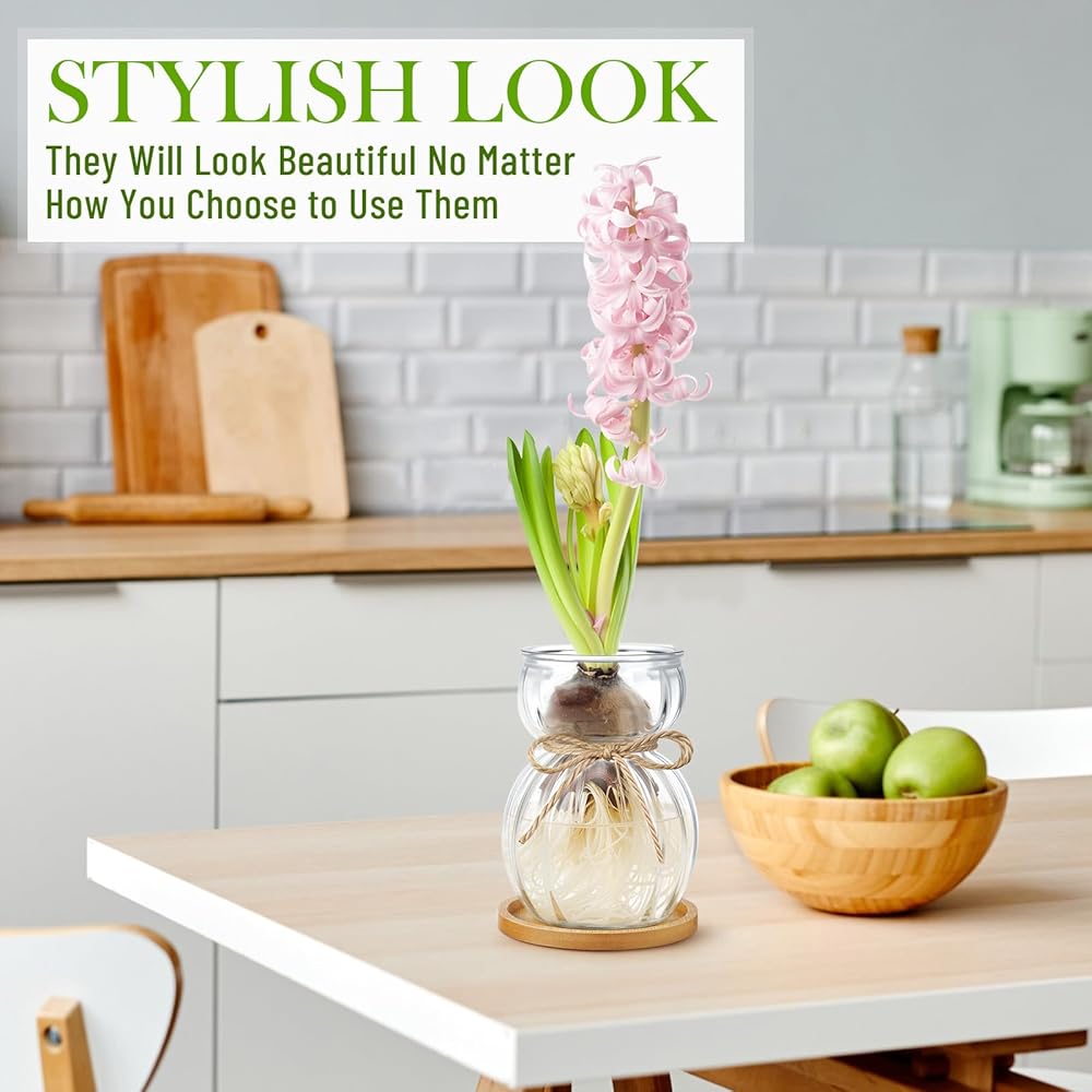 • Reliable Materials: the flower bulb vase is made using high density glass and the coaster adopts quality bamboo materials, the base ensures the glass vase is sturdy and stable; A transparent surface allows you to easily track the growth of plant roots, and they provide you with a nice using experience