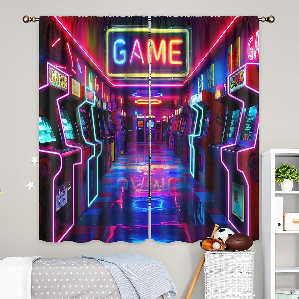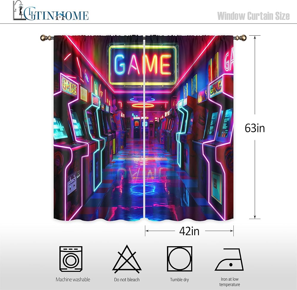 LIGHTINHOME Neon Arcade Game Curtains 42Wx63H Inch Retro Gamer Video Arcade Gaming Cool 80s 90s Window Curtains for Boys Bedroom Kids 2 Panels Rod Pocket Living Room Window Drapes Treatment Fabric