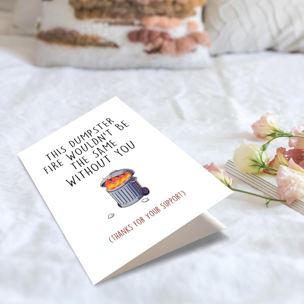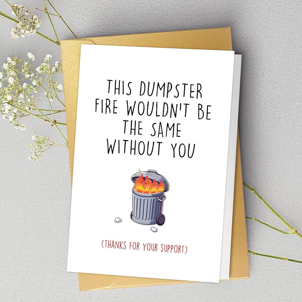 Show your appreciation and let them know you're grateful for their support with our quirky, one-of-a-kind thank you card. Embrace the chaos of life and spread a little laughter with our DUMPSTER FIRE card!