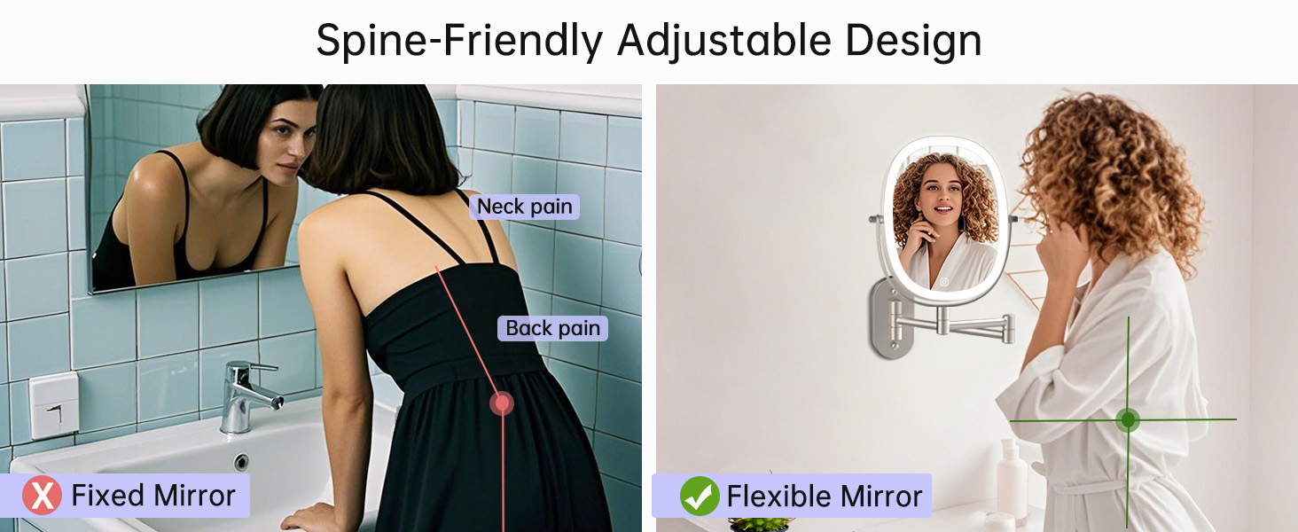 【360°ROTATION & EXTENDABLE ARM MAKEUP MIRROR】 The bathroom magnifying mirror with retractable arm (13 inch) allows you to fix the mirror in the best position and adjust the arm to any angle you need to achieve perfect viewing. 360 degree free rotation can provide you with a comfortable perspective. When not in use, you can fold the bathroom vanity mirror back on the wall to save space.