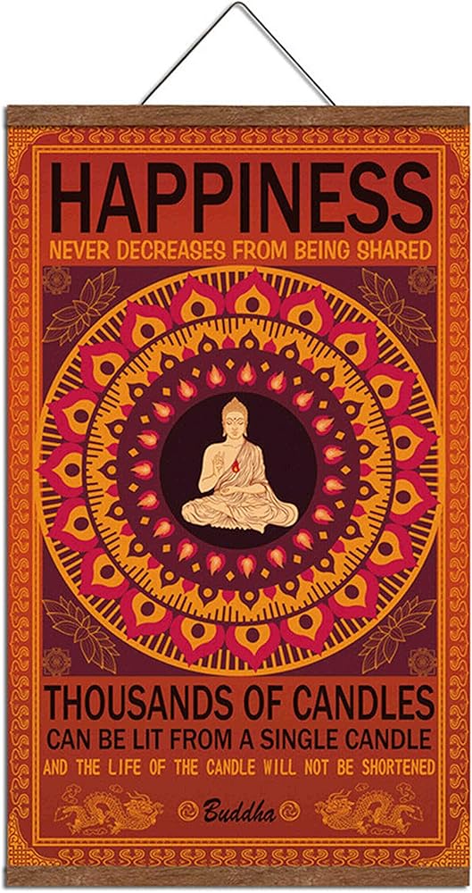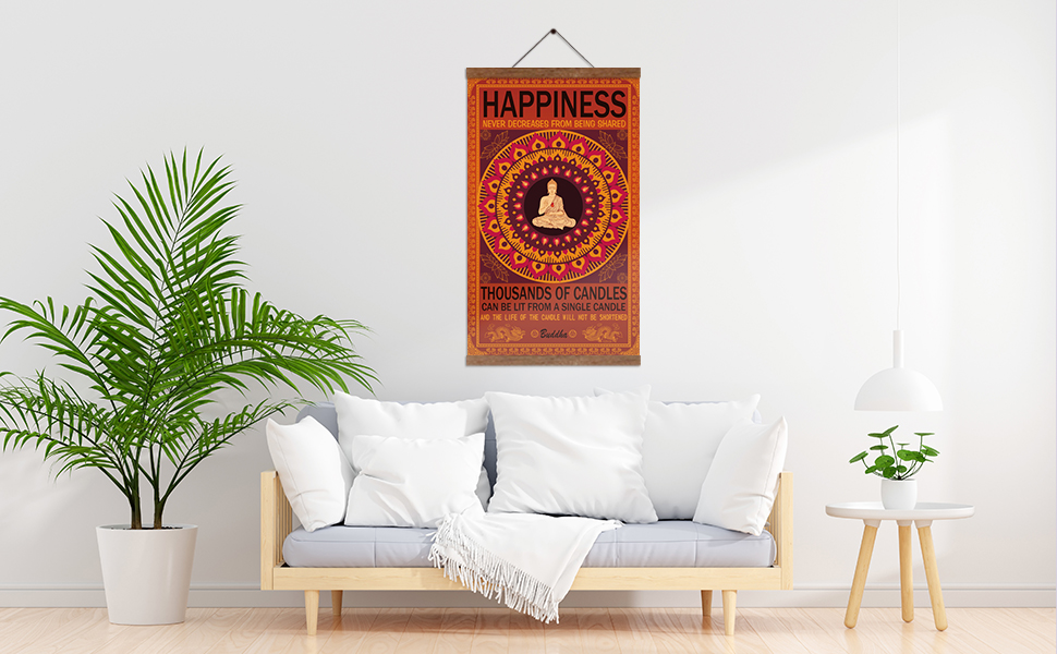 WEROUTE Buddha Wall Art Zen Decor Printed on Canvas with Scroll Wood Frame Hanger Poster Happiness Quote Motivational Home Decor Hanging Painting 15.7 x 27 inch
