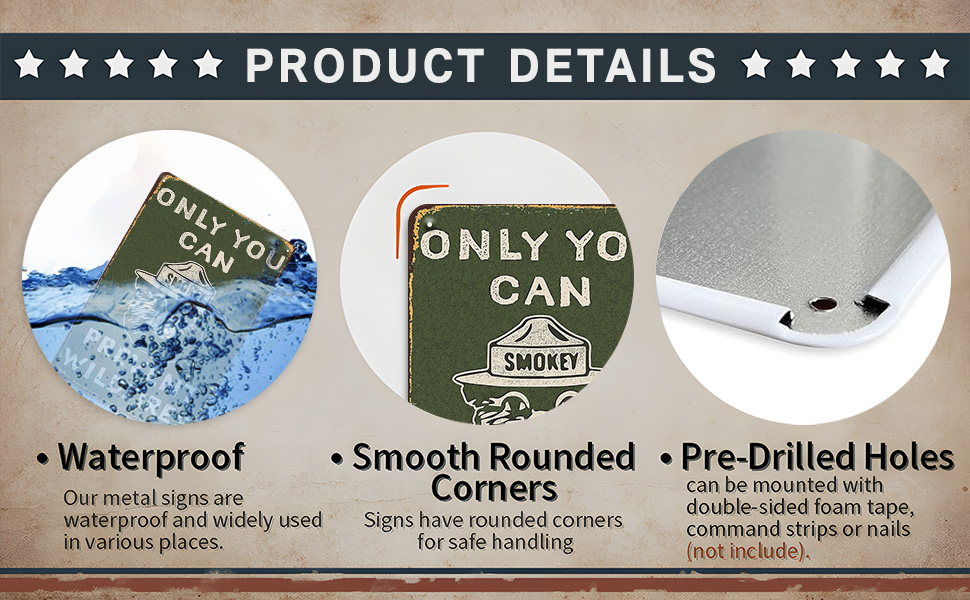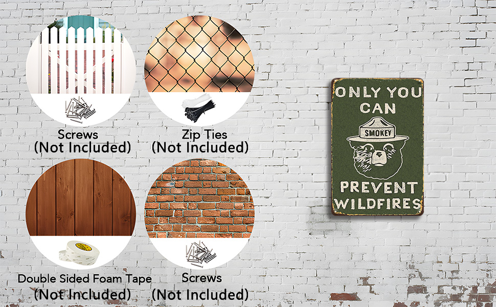 【Easy to Install 】Funny smoky the bear tin sign vintage have 4 pre-drilled holes. You can use screws, double sided tape or ropes to permanent install or hanging on the wall, door, siding, fences, etc.