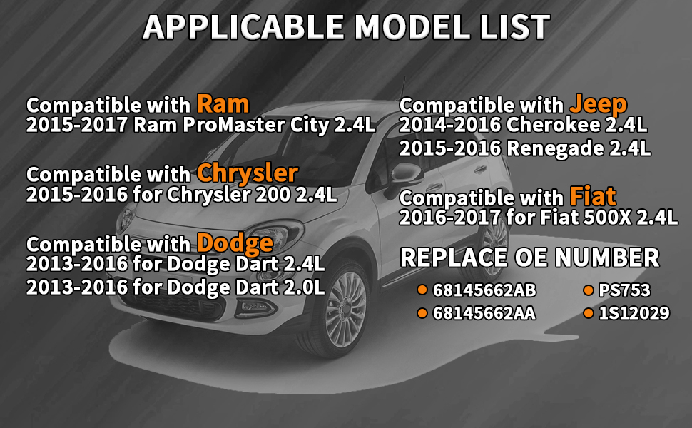 【Compatibility】- Fit for Ram ProMaster City 2.4L 2015-2017; Fit for Chrysler 200 2.4L 2015-2016; Fit for Dodge Dart 2.0L 2.4L 2013-2016; Fit for Jeep Cherokee 2.4L 2014-2016, Renegade 2.4L 2015-2016; Fit for Fiat 500X 2.4L 2016-2017