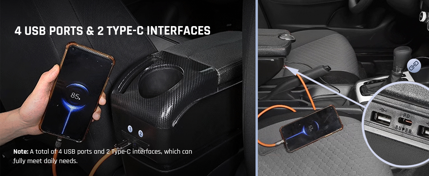4 USB Ports and 2 Type-C Interfaces: The Car Armrest Box has 2 USB and 1 Type-C interface at the front and back, a total of 4 USB ports and 2 Type-C interfaces, which can fully meet daily needs.