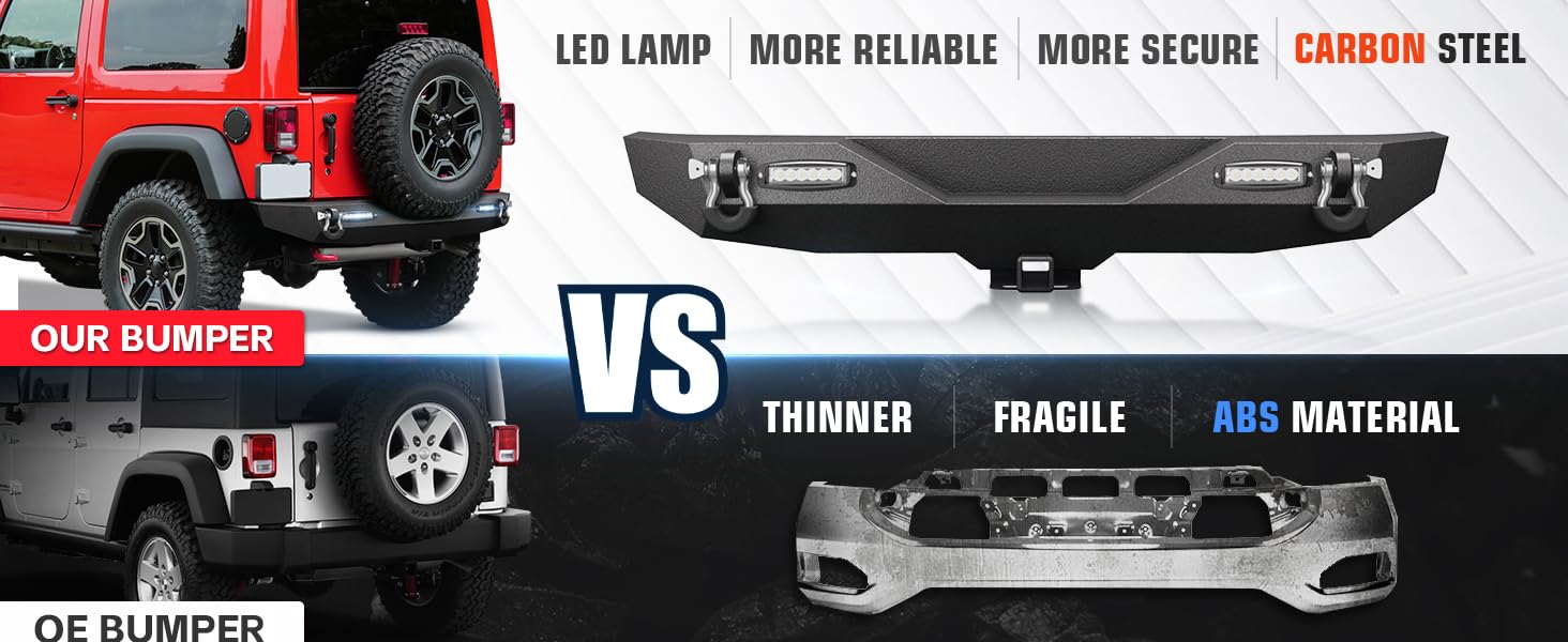 【Premium Quality Materials】EYOUHZ JK rear bumper is made of high-strength steel for superior durability. With a two-stage textured black powder coating, it offers both style and enhanced protection. It is rust-resistant, ensuring long-lasting performance and aesthetics even if the powder coat gets damaged.