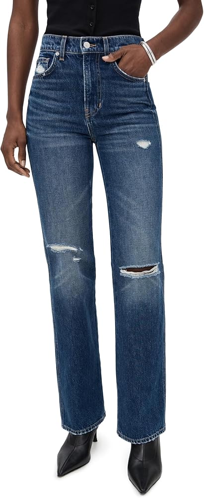 - Fading and whiskering, Distressed detailing, V belt loops at back