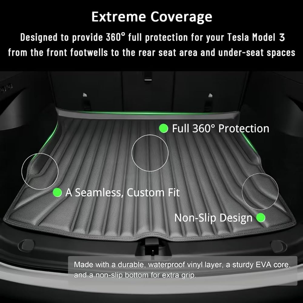 Enhanced Protection for Modern EVs: Address Coverage Gaps in Traditional Mats — Premium vehicles often benefit from comprehensive surface safeguards. CabinProtect Pro helps provide extended coverage for floors, seats, trunk bases, and door thresholds – moving beyond footwell-only designs. Precision-designed 2025 model 3 soft floor mats for Tesla minimalist interiors using laser-measured components, eco-conscious materials, and tool-free installation.