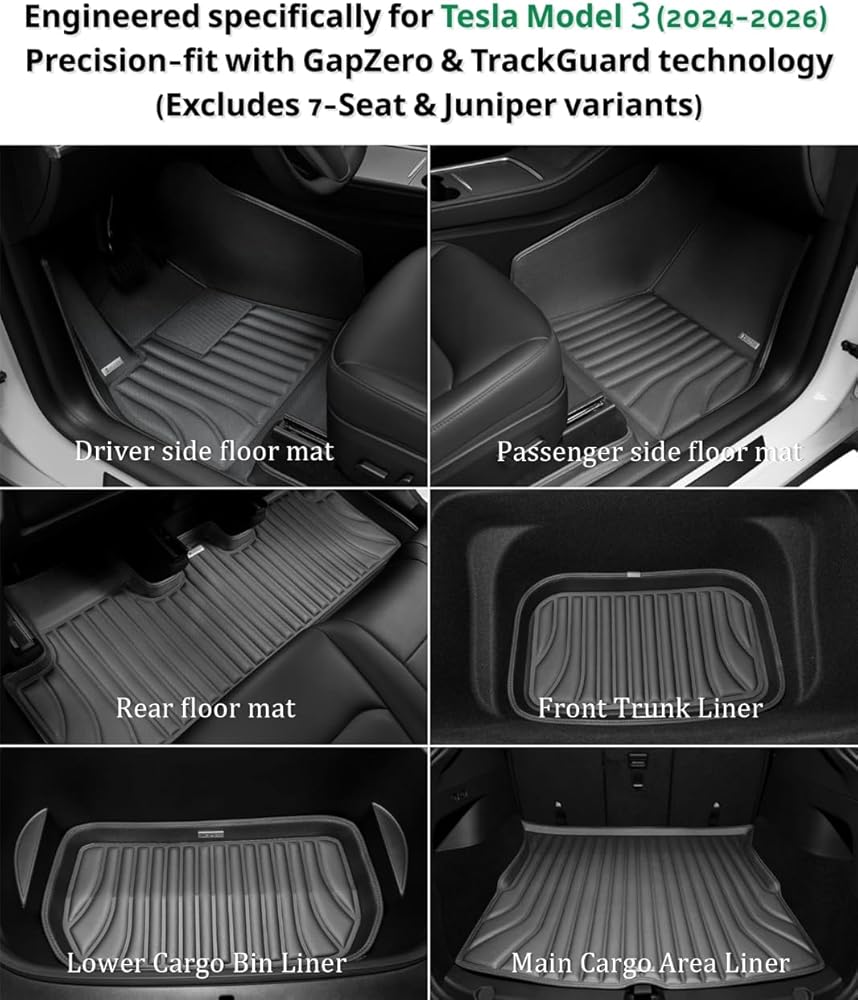 SUPER LINER 6 PCS Soft Floor Mats & Accessories for Tesla Model 3 Highland (2024,2025,2026) – Custom Fit All Weather Protection Full-CabinProtect™ System Cargo Liners