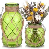 Set of 2 Coastal Vase Dark Blue Glass Vase with Rope Rattan Hanging Mason Jar Wicker Boho Farmhouse Coastal Decor Sea Beach Bottle for Arrangement Wedding Party Table Decorations